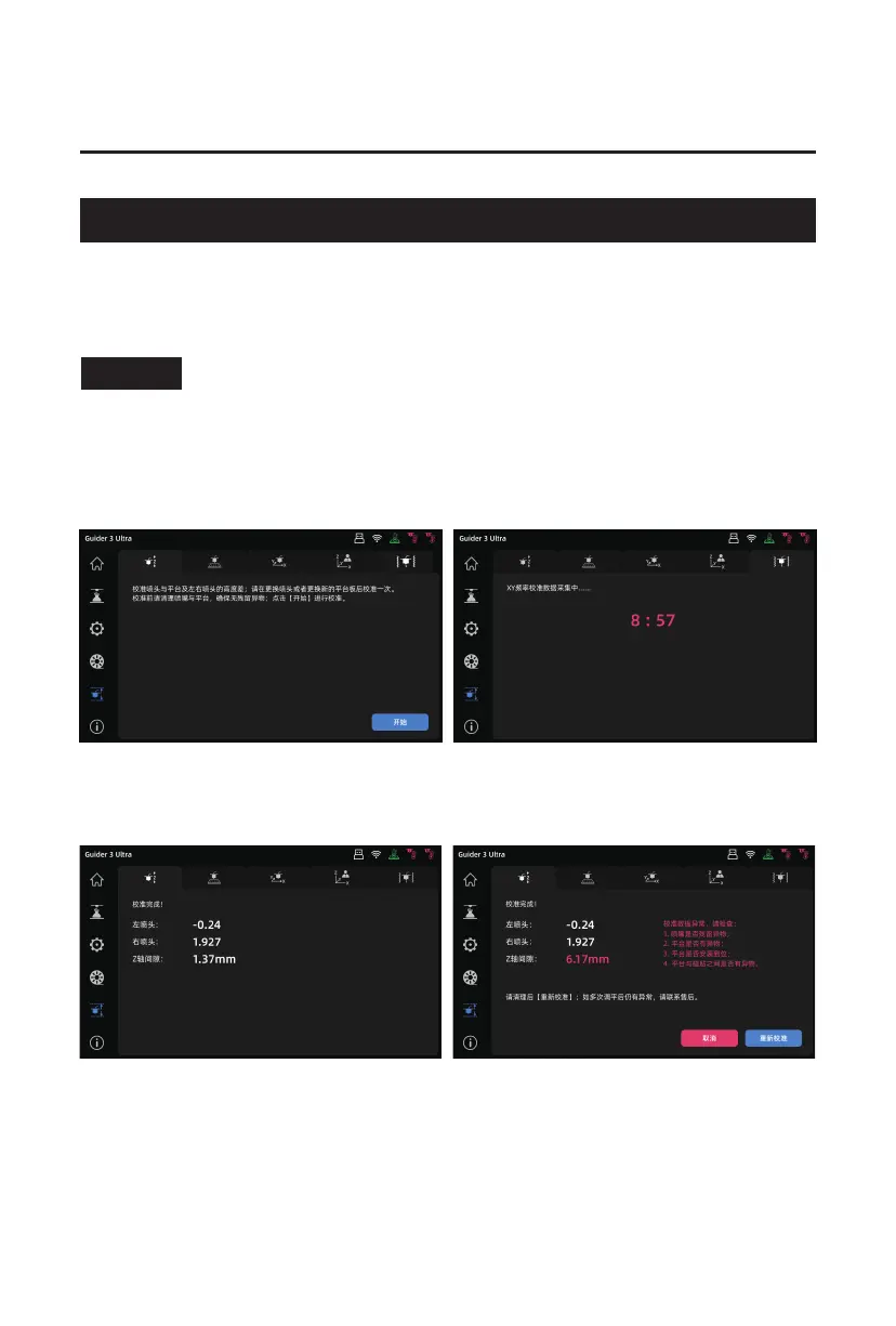 首次开机进入开机引导,将会引导操作进行自动Z轴校准和平台调平,请根据界面指示操作。平时