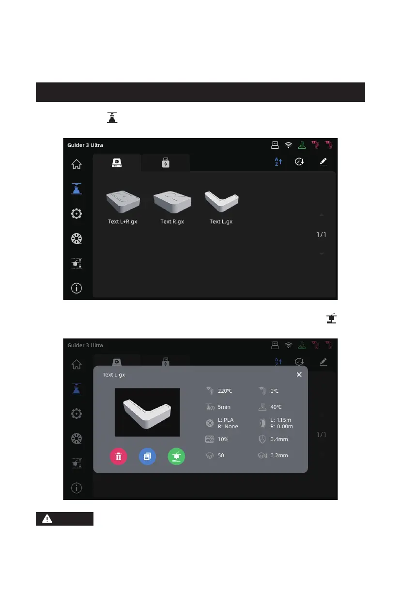 1. 在触控屏左侧点击 图标进入打印界面,机器设备内会有三个测试模型,分别是Test L.gx(左