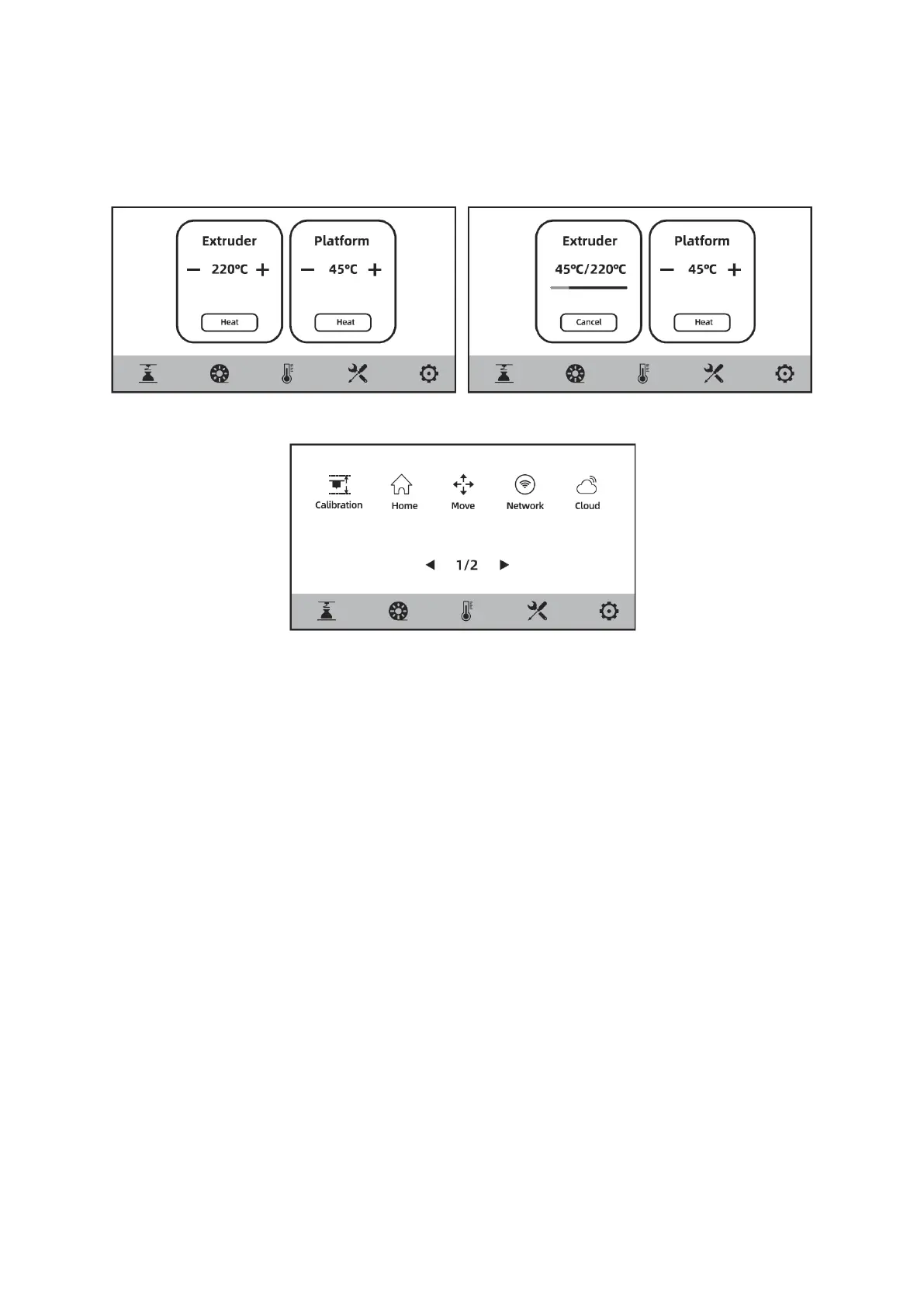 Az extruder és a platform hőmérséklete az előmelegítő képernyőn igény szerint előre