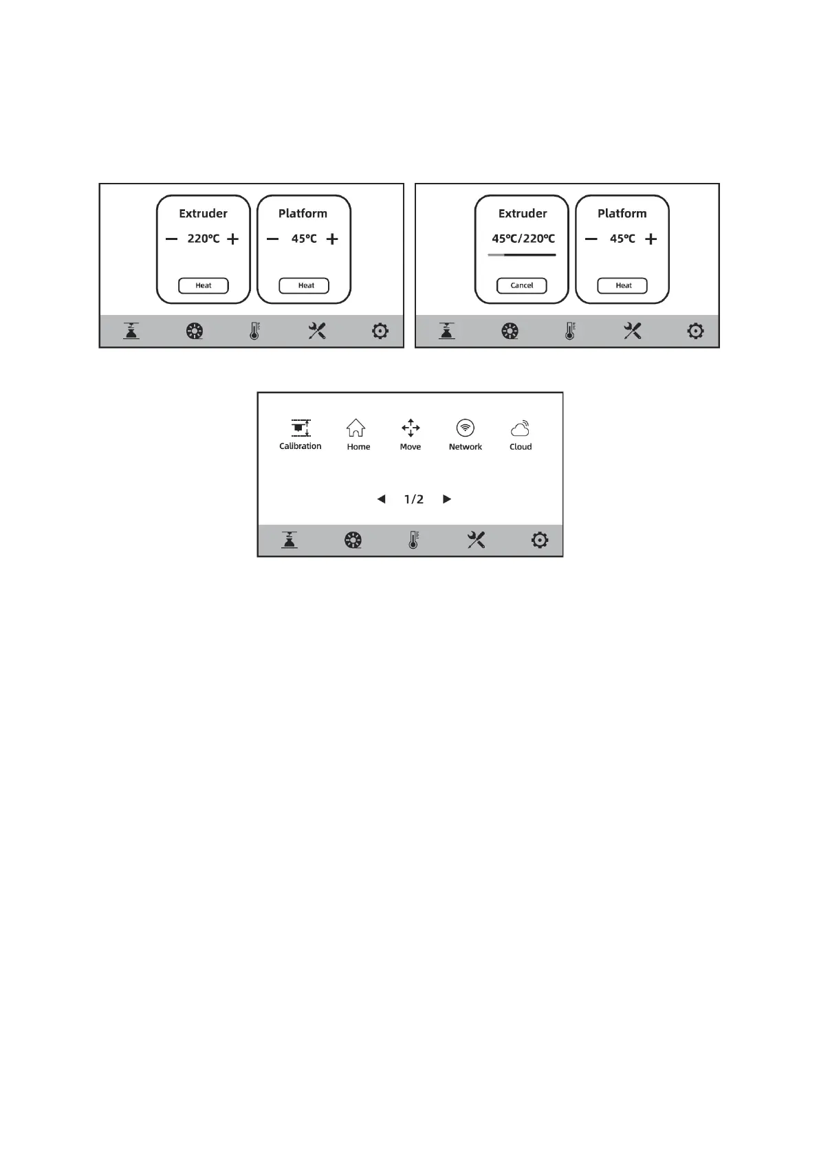 Die Extruder- und Plattformtemperatur kann auf dem Vorheizbildschirm nach Bedarf