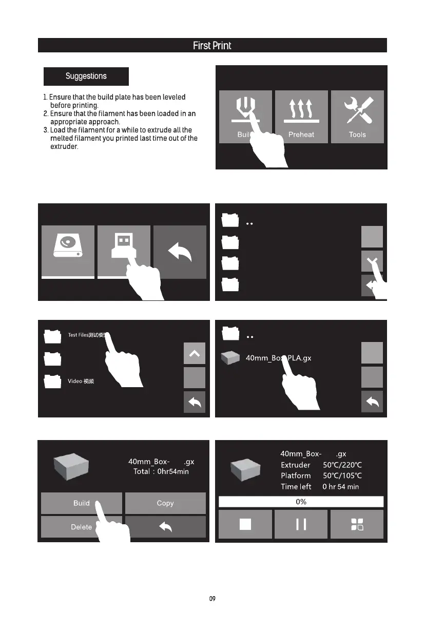 6. Tap [Build]. 7. The printer starts to heat and it prints