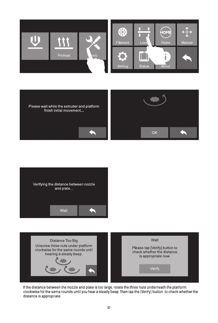 3. Please wait while the extruder and platform finish initial movements. Screw three nuts under the