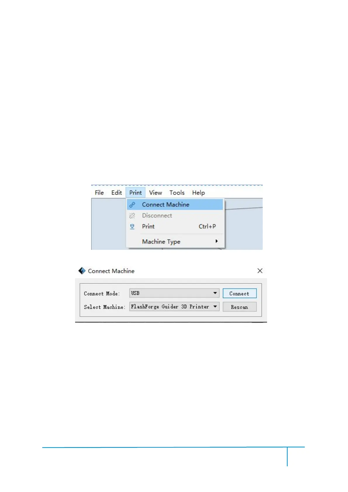 [Connect] to start USB connection, and transfer your Gcode file to your Guider.