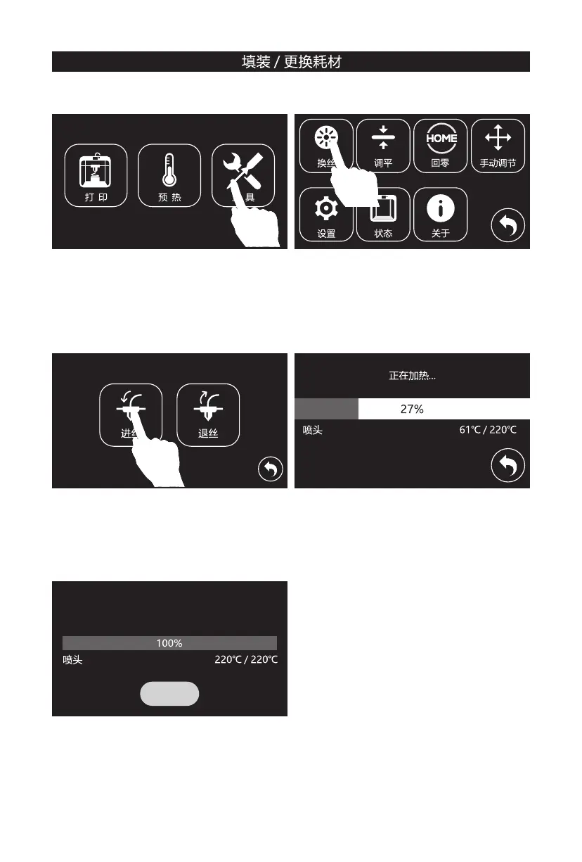 3. 在点击[进丝]。 4. 喷头会自动开始加热。