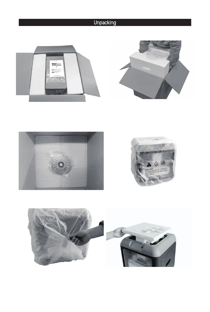 5. Remove the tape and the packing bag. 6. Remove the top foam piece.
