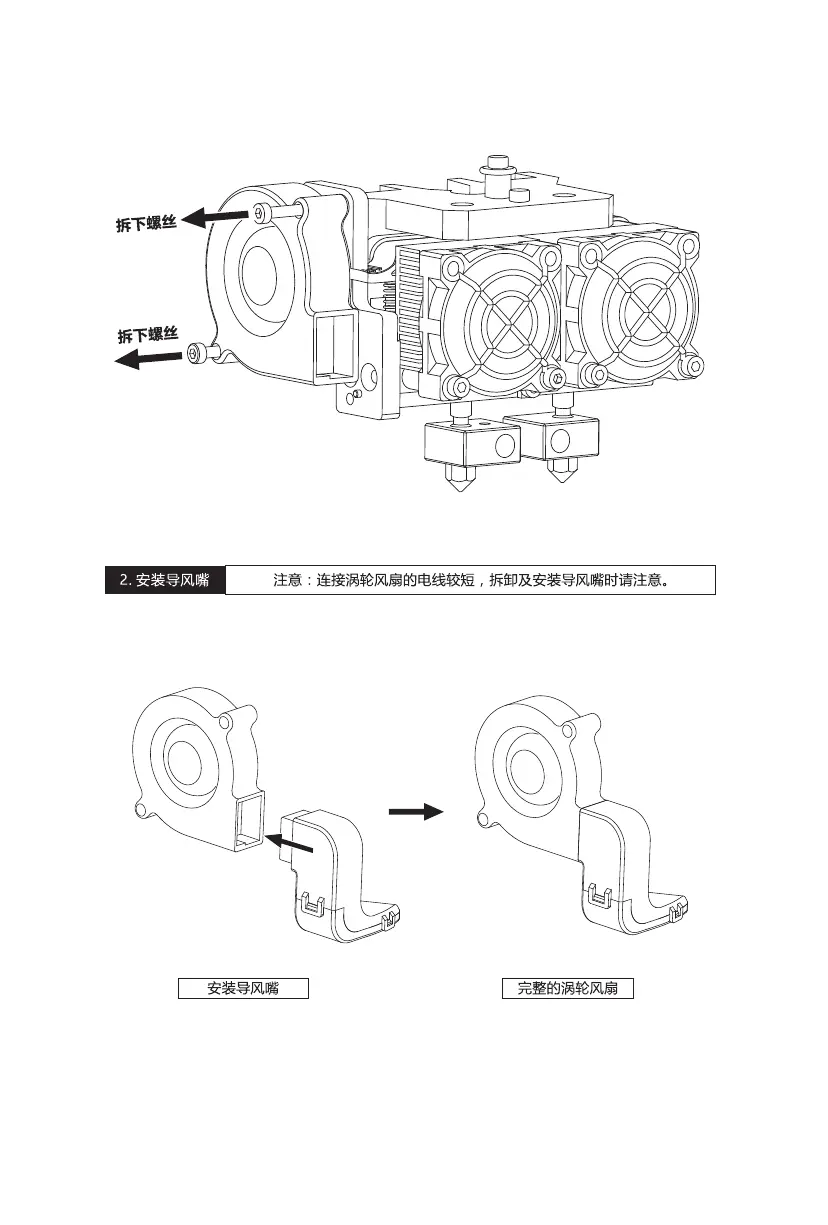 2. 从喷头安装包中取出导风嘴部件。如下图所示,将导风嘴部件装入涡轮风扇。