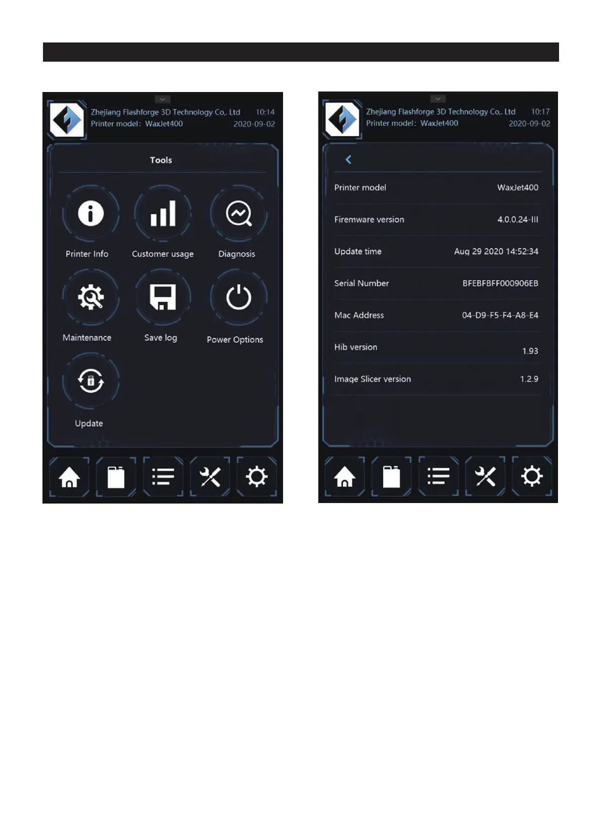 1. Tap here and enter to the tools interface Printer information: Display information of printer and version.