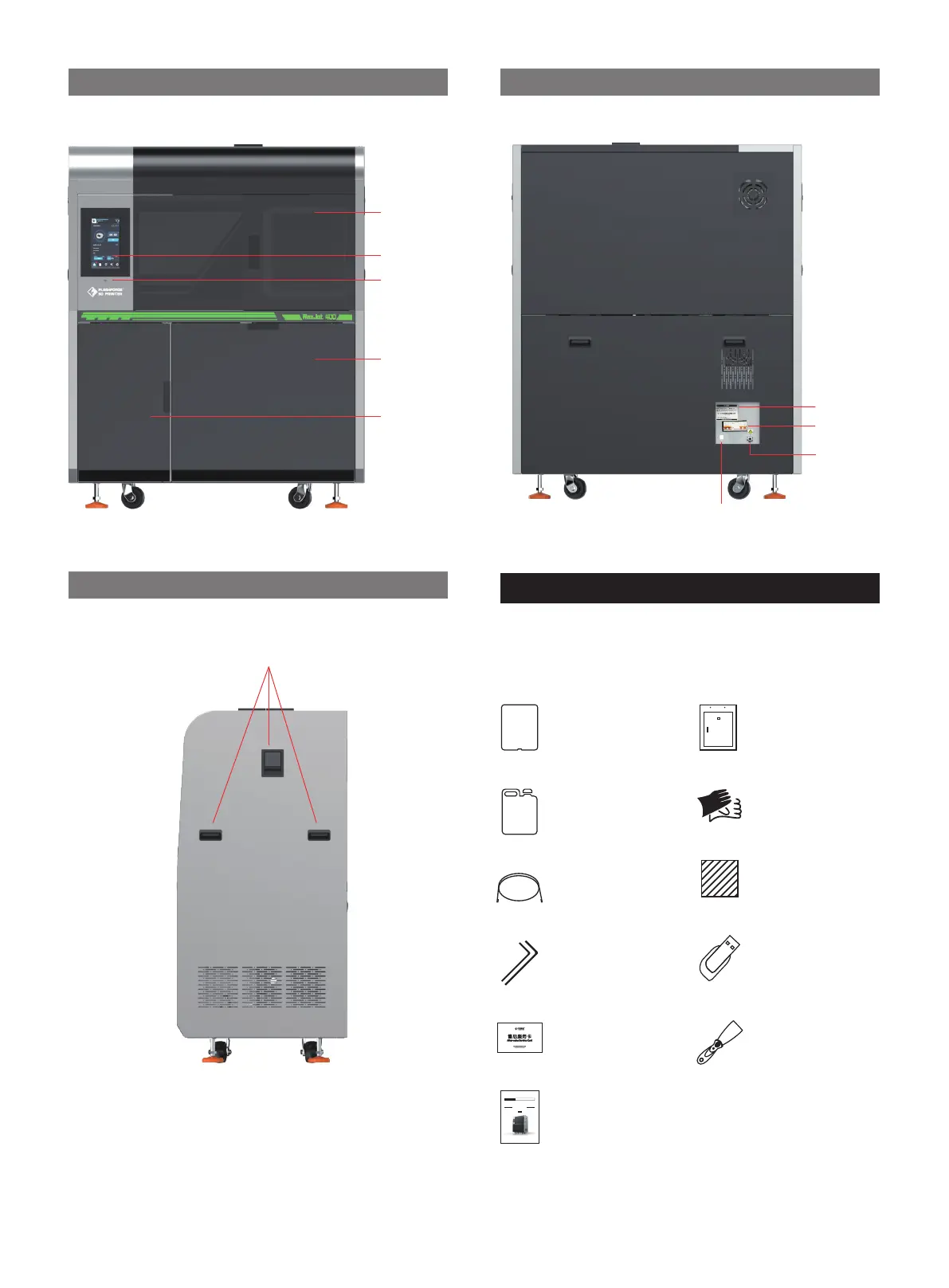 Flashforge Waxjet 410 - Machine Front View; Machine Side View; Machine Back View; Accessories