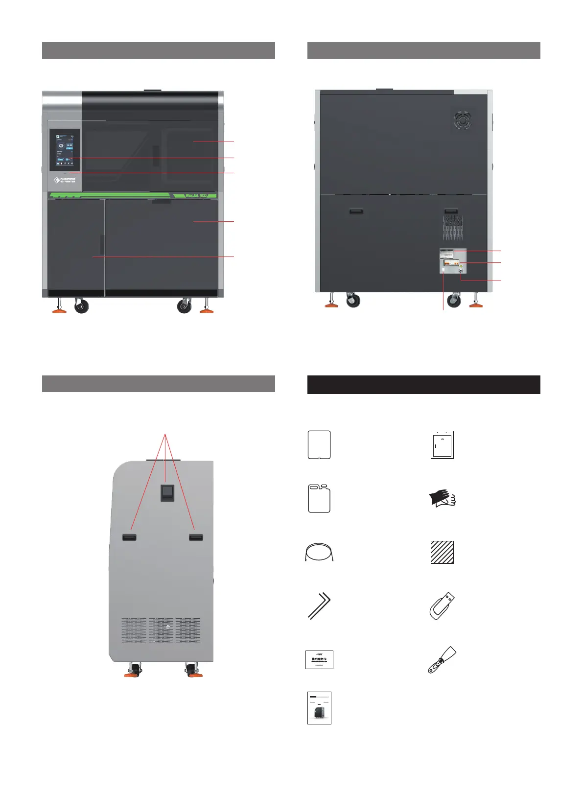 Flashforge Waxjet 410 - 侧面构造视图; 正面构造视图; 背面构造视图; 随机配件