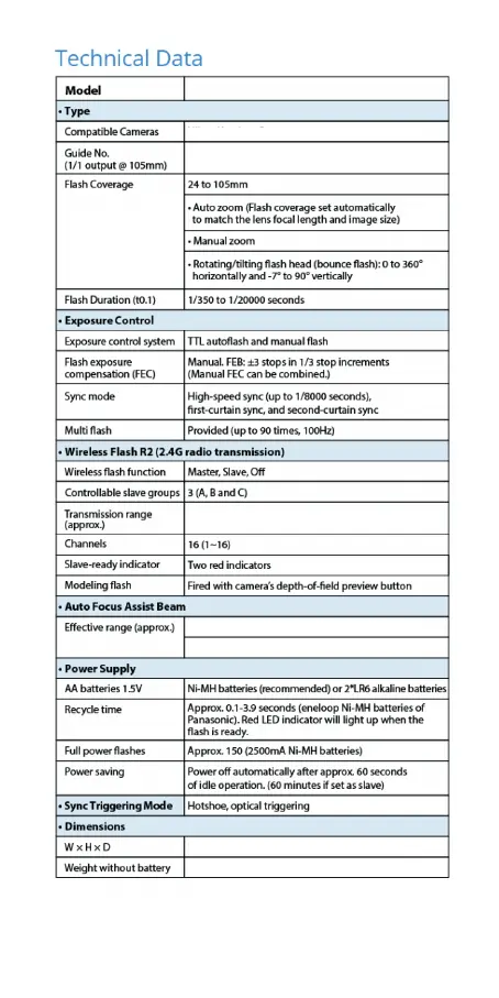 FlashPoint Zoom Mini - Technical Specifications; Model and Compatibility; Exposure Control and Sync Modes; Power and Dimensions
