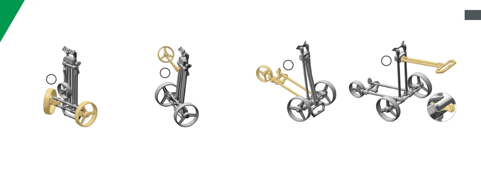 Unfold front wheel with lower frame. Bring handle in position and adjust if necessary.