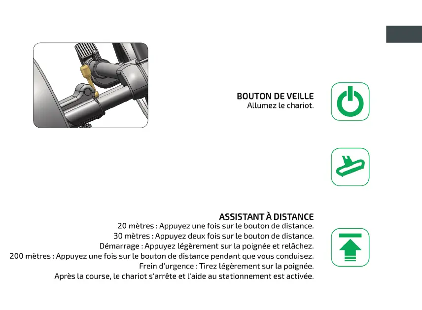 Après la course, le chariot s'arrête et l'aide au stationnement est activée.