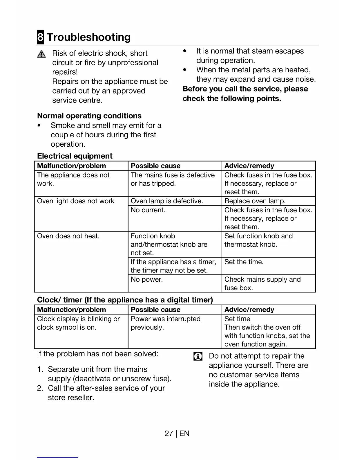 Flavel FL 95 CRX - Troubleshooting and Service; Troubleshooting Common Issues