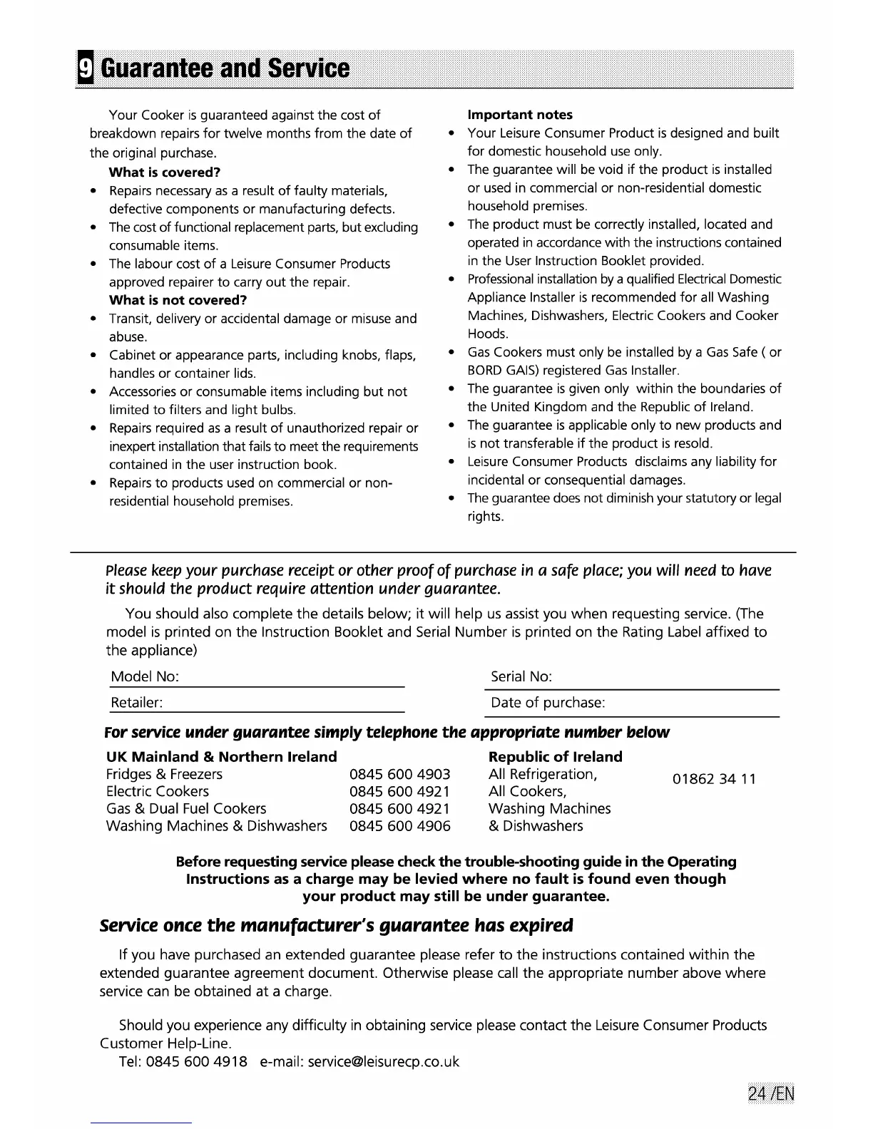 Flavel FSBE50 - Guarantee and Service Information; Understanding Product Guarantee; Service and Support Contact