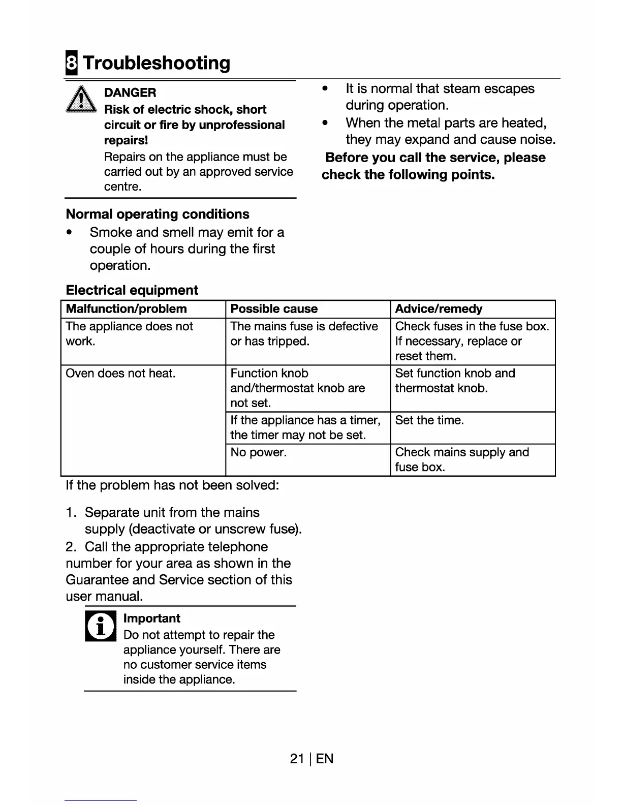 Flavel FSE50 - Troubleshooting; Electrical Equipment Malfunctions