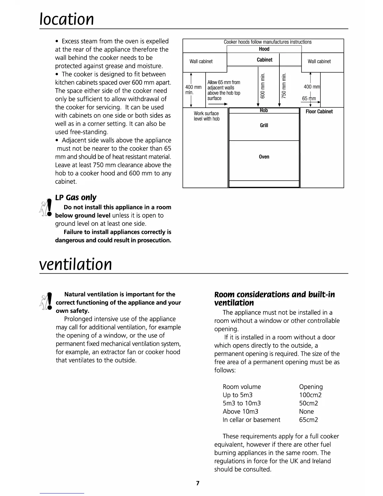 Flavel ML51NDSP - Location; Ventilation; Room Considerations and Built-In Ventilation
