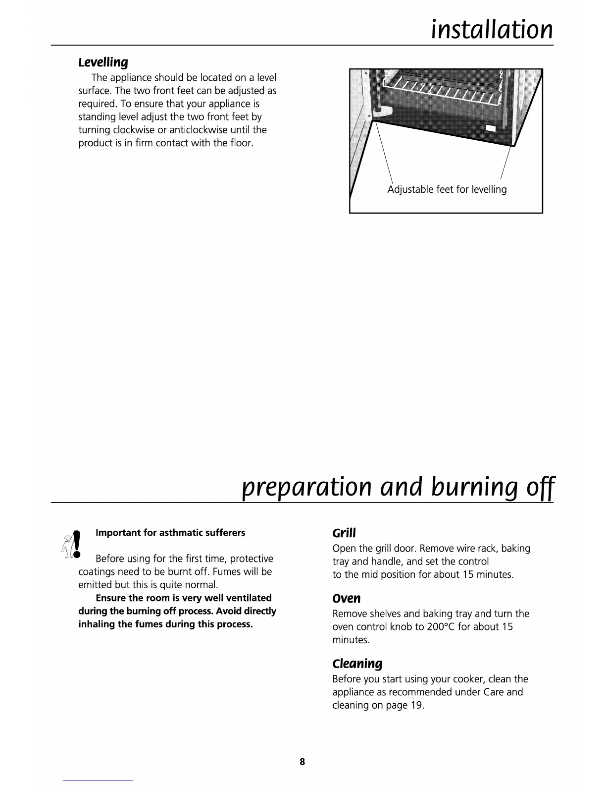 Flavel ML5CDW - Installation and Preparation; Appliance Levelling; Initial Burn-off Process