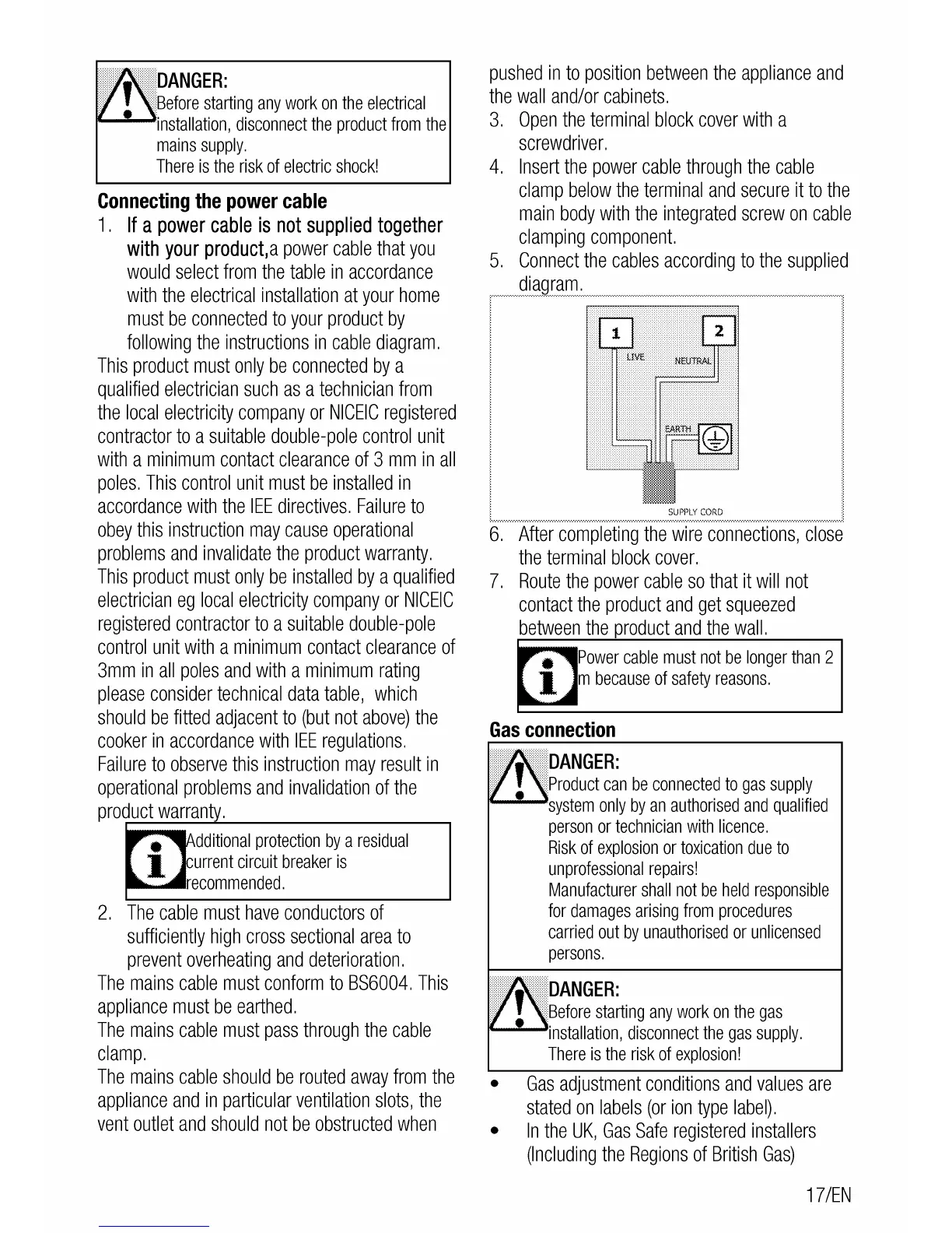 Flavel MLN10FRS - Connecting the power cable; Gas connection