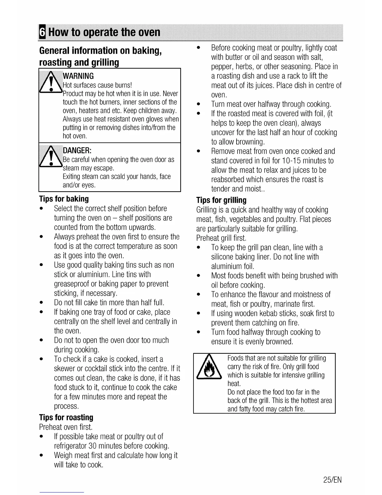 Flavel MLN10FRS - How to operate the oven; General information on baking, roasting and grilling; Tips for baking; Tips for roasting