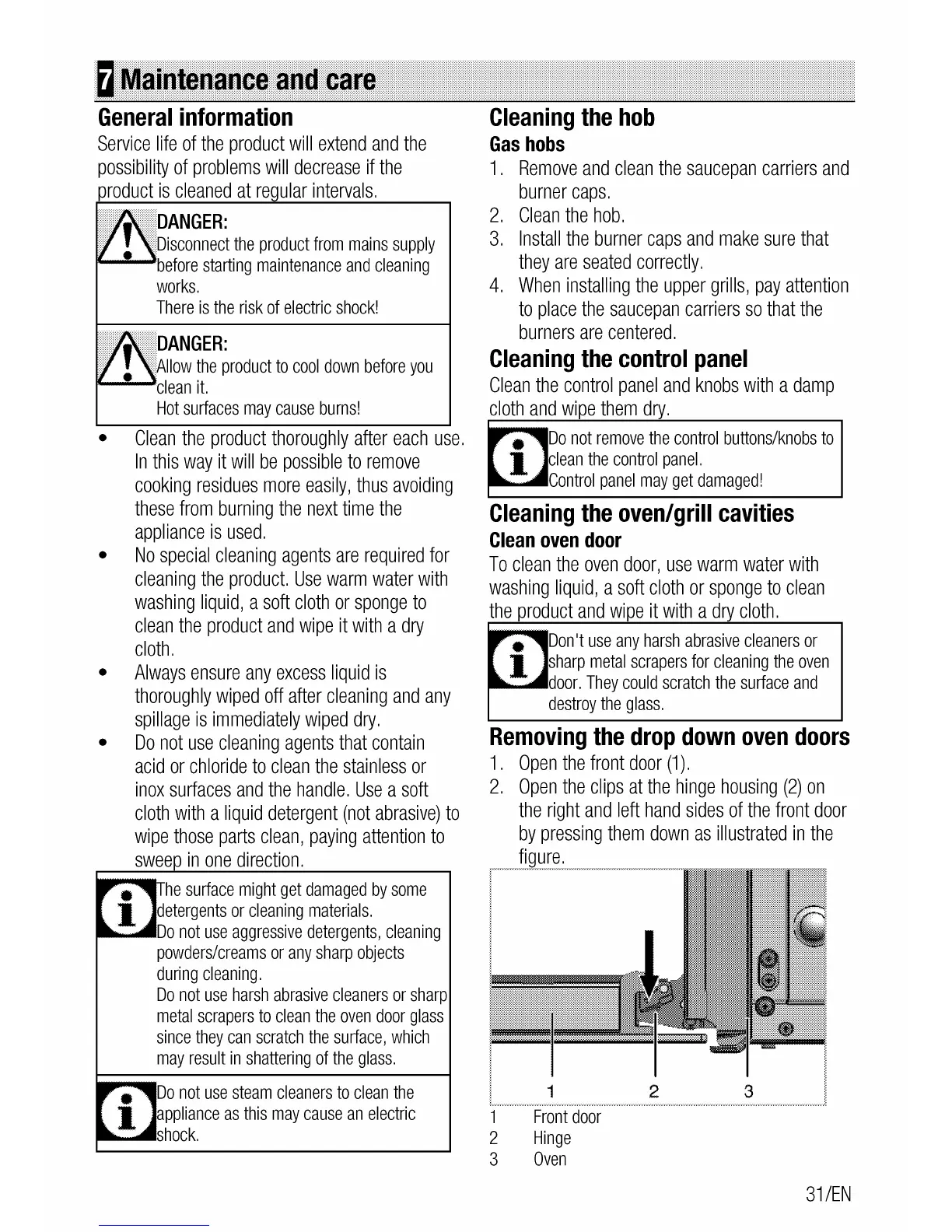 Flavel MLN10FRS - Maintenance and care; Cleaning the hob; Cleaning the control panel; Cleaning the oven and grill cavities