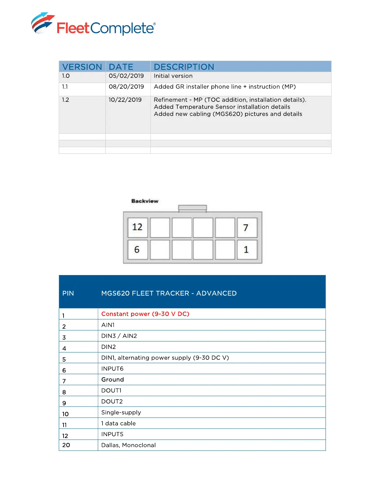 Fleet Complete MGS620 - Revision History; Pin Layout MGS620