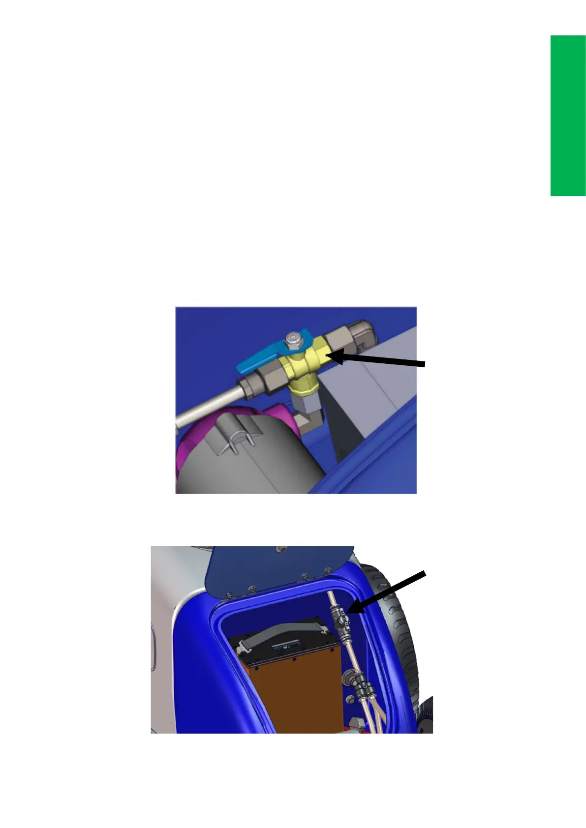 2. Turn the flow return tap through 90 degrees (in line with hose. See