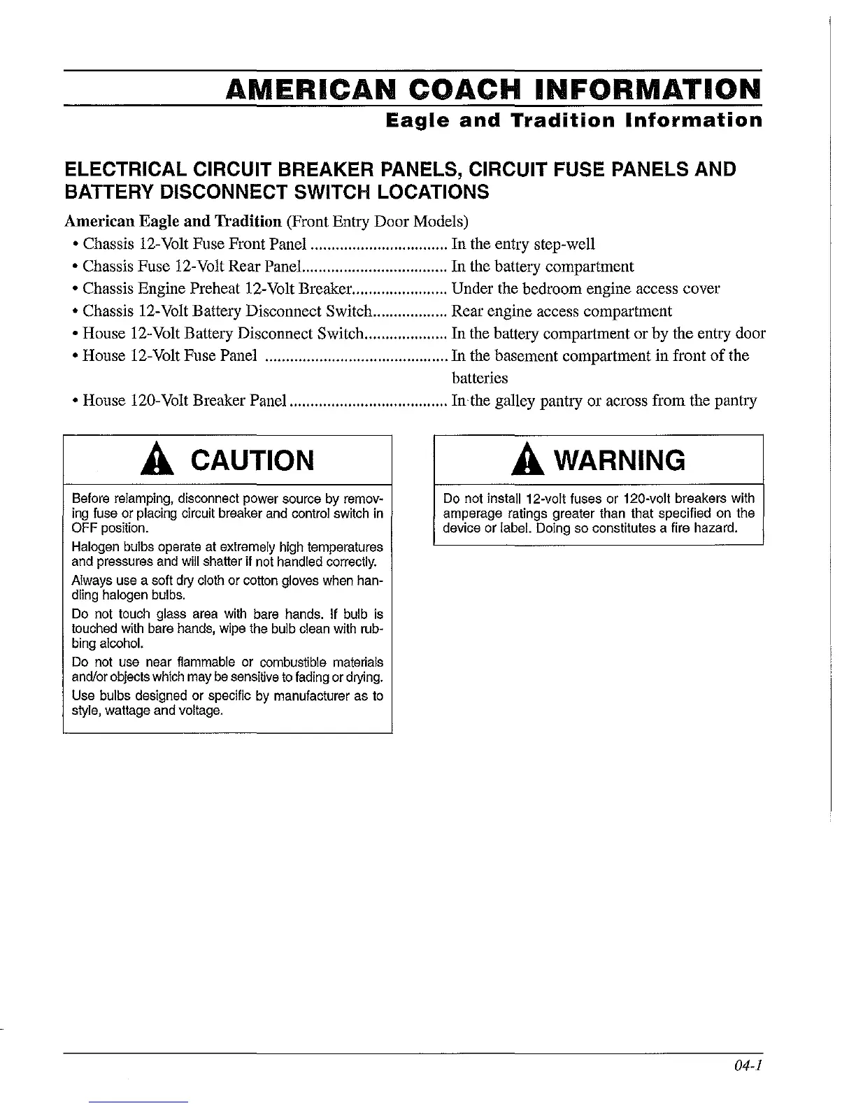 • Chassis Engine Preheat 12-Volt Breaker. ...................... Under the bedroom engine access cover