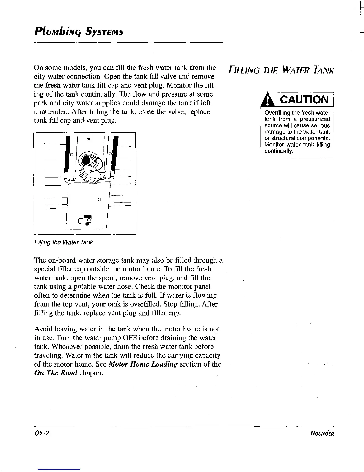 the fresh water tank fill cap and vent plug. Monitor the fill-