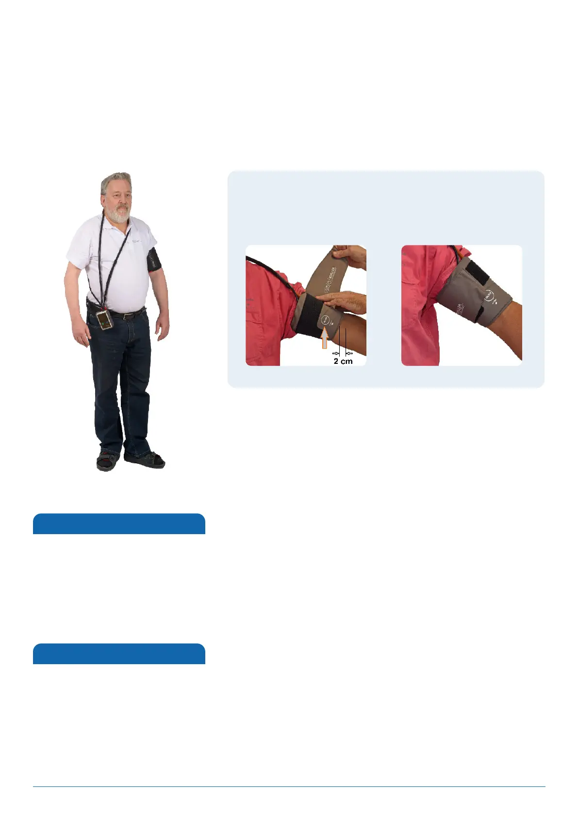 The cuff should be placed on the left upper arm approximately 2cm above the elbow so that the