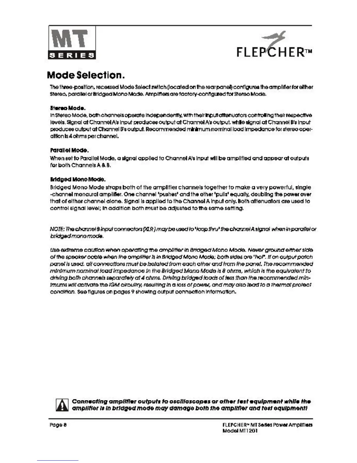 Flepcher FLP-MT1201 - Mode Selection and Operation Modes; Mode Selection Switch Function; Bridged Mono Mode Safety Considerations