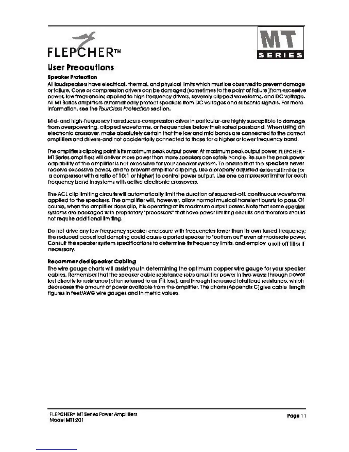 Flepcher FLP-MT1201 - Speaker Protection and Cabling; Preventing Speaker Damage; Recommended Speaker Cable Selection