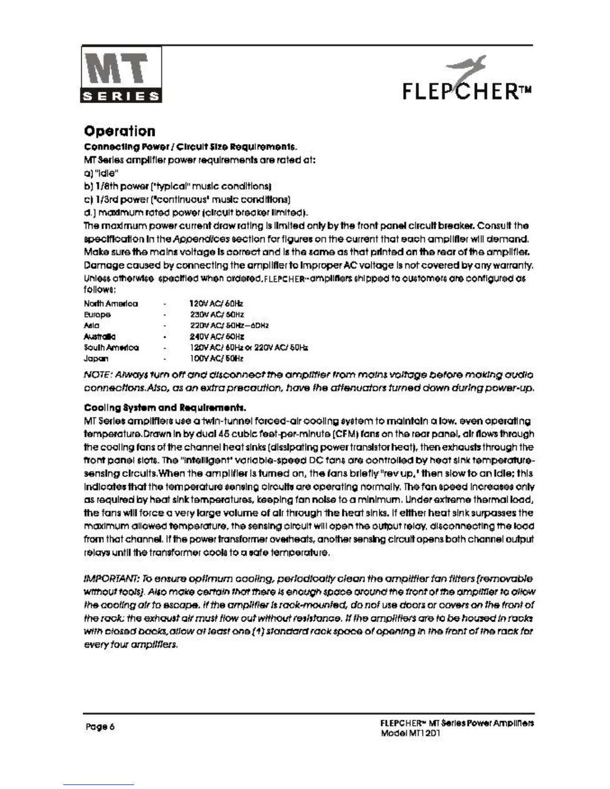 Flepcher FLP-MT1201 - Amplifier Operation and Cooling; Power and Circuit Requirements; Cooling System and Airflow