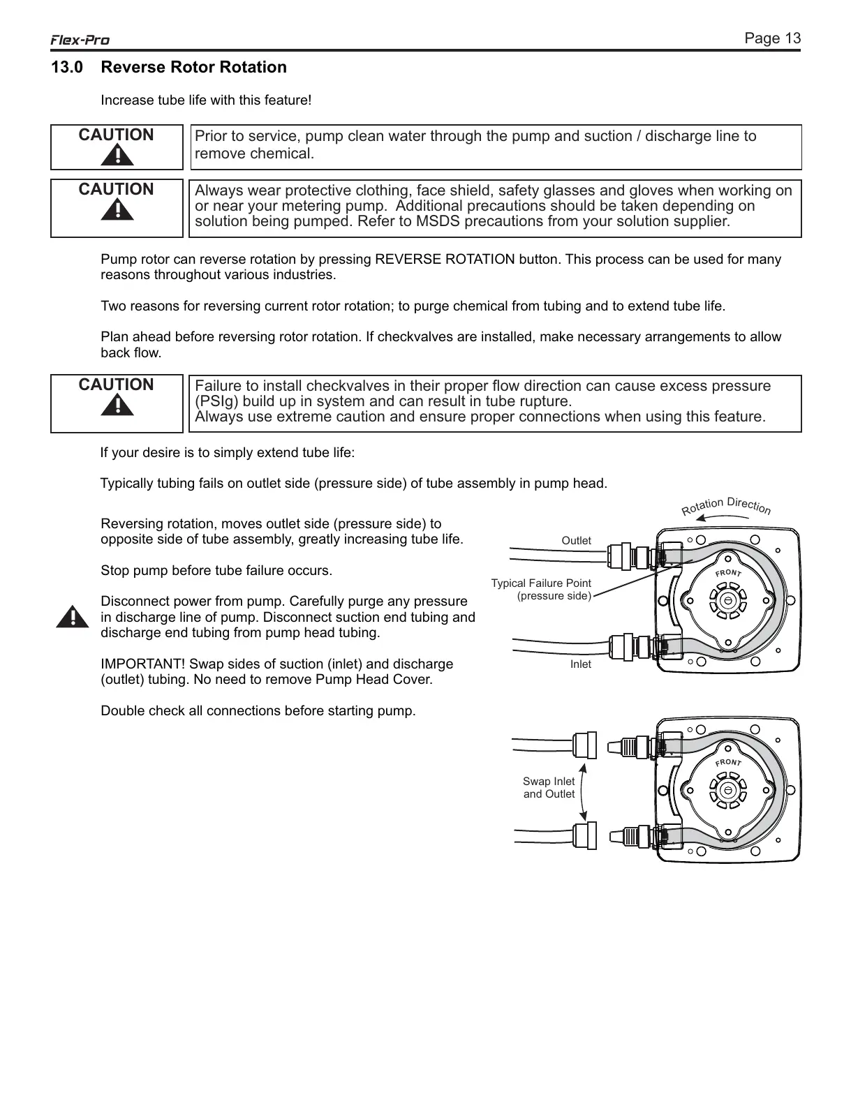 Two reasons for reversing current rotor rotation; to purge chemical from tubing and to extend tube life.