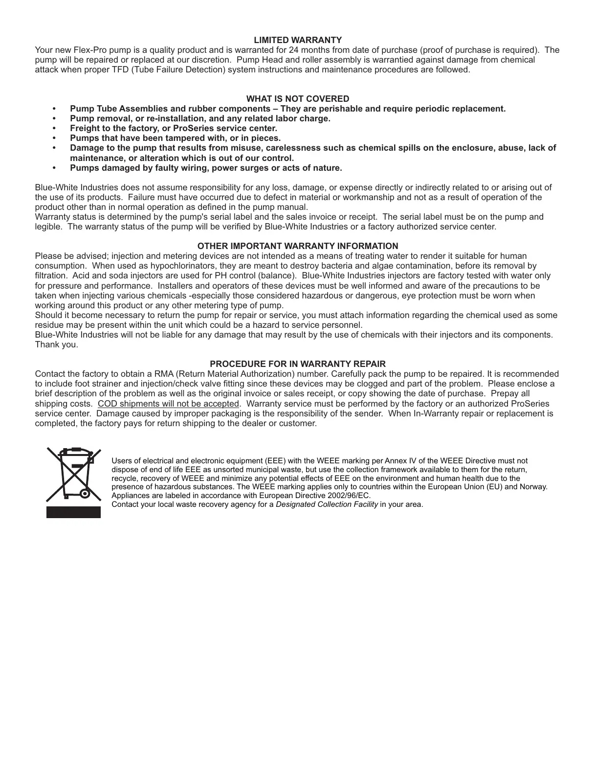 Your new Flex-Pro pump is a quality product and is warranted for 24 months from date of purchase (proof of purchase is required). The