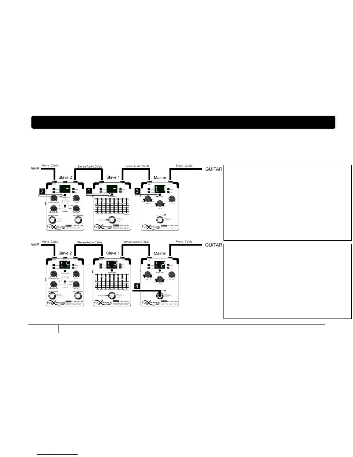 The FW BALANCED CABLE LINK MODE™ gives you the total control of your sounds using only one footswitch. It‟s like having a