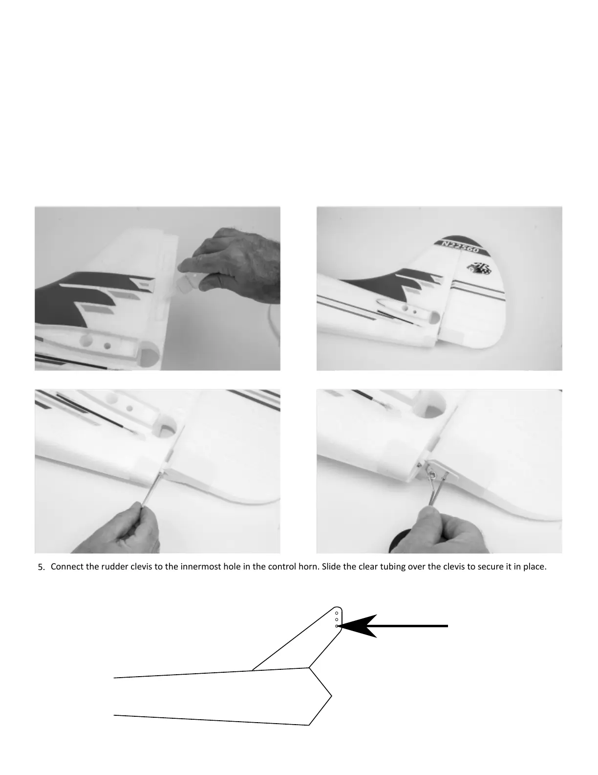Connect the rudder clevis to the innermost hole in the control horn. Slide the clear tubing over the clevis to secure it in place.