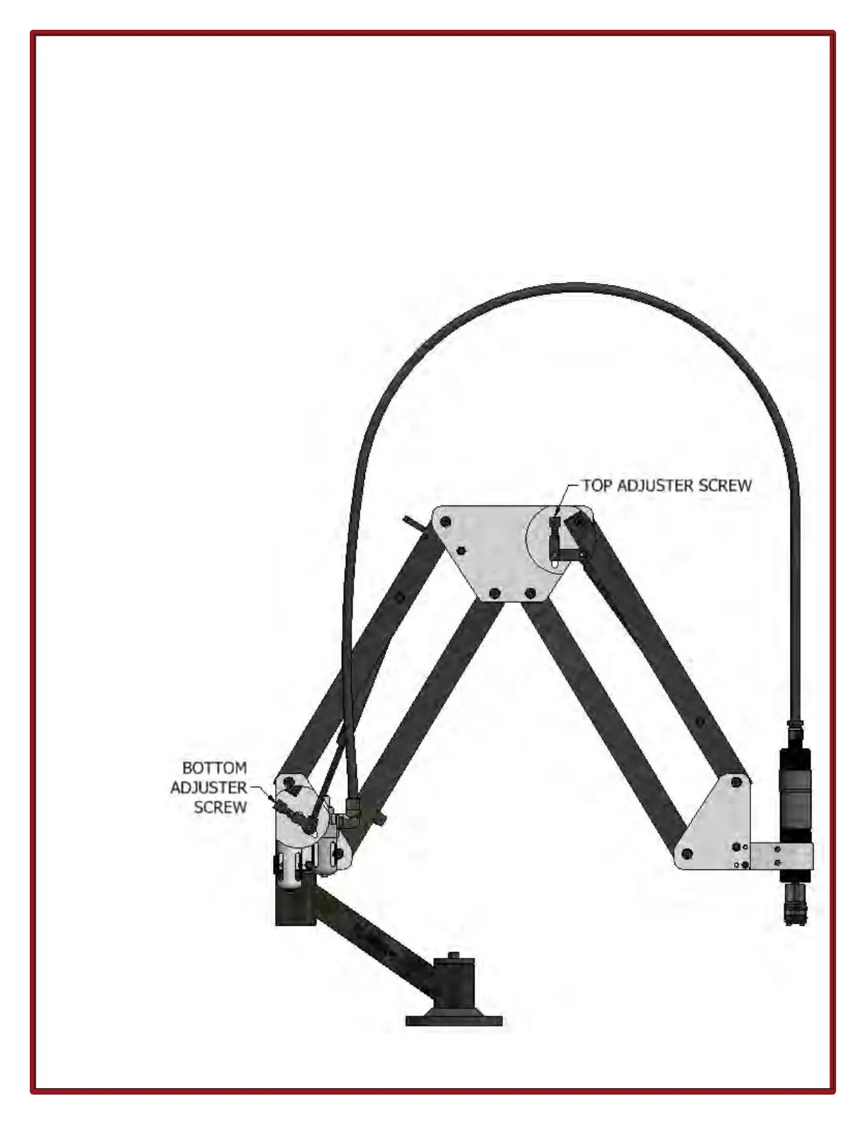 To adjust the counterbalance, turn the adjuster screw located between the top plates for the front arms, and