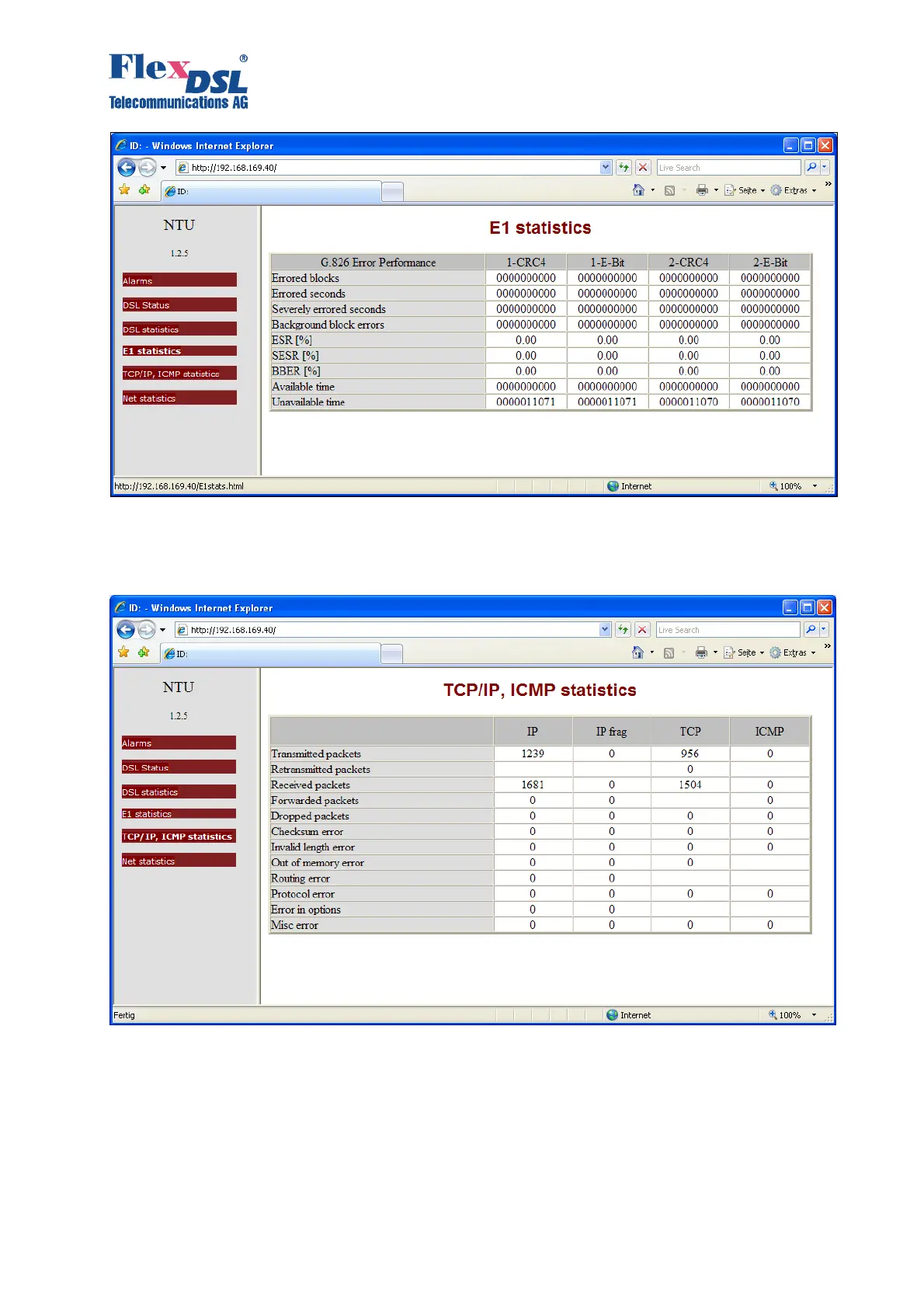 Figure 3.22. “Table of E1 statistics (according to ITU-T G.826) for FlexDSL Orion 2 devices”