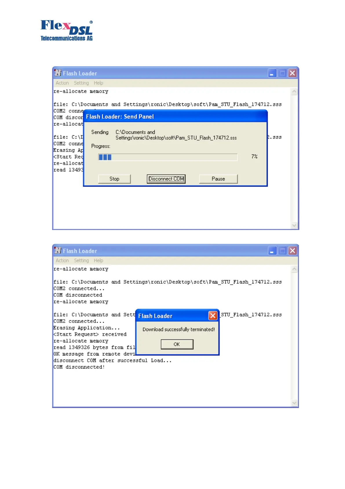 10. The loading progress will be displayed in the window “Flash Loader: Send Panel”.