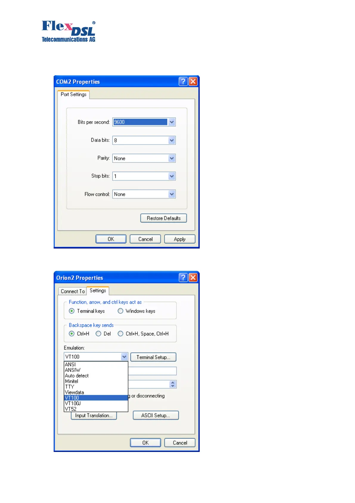 8. Select the “Setting” tab. Select the VT100 emulation in the “Emulation” menu. Click “Ok”.