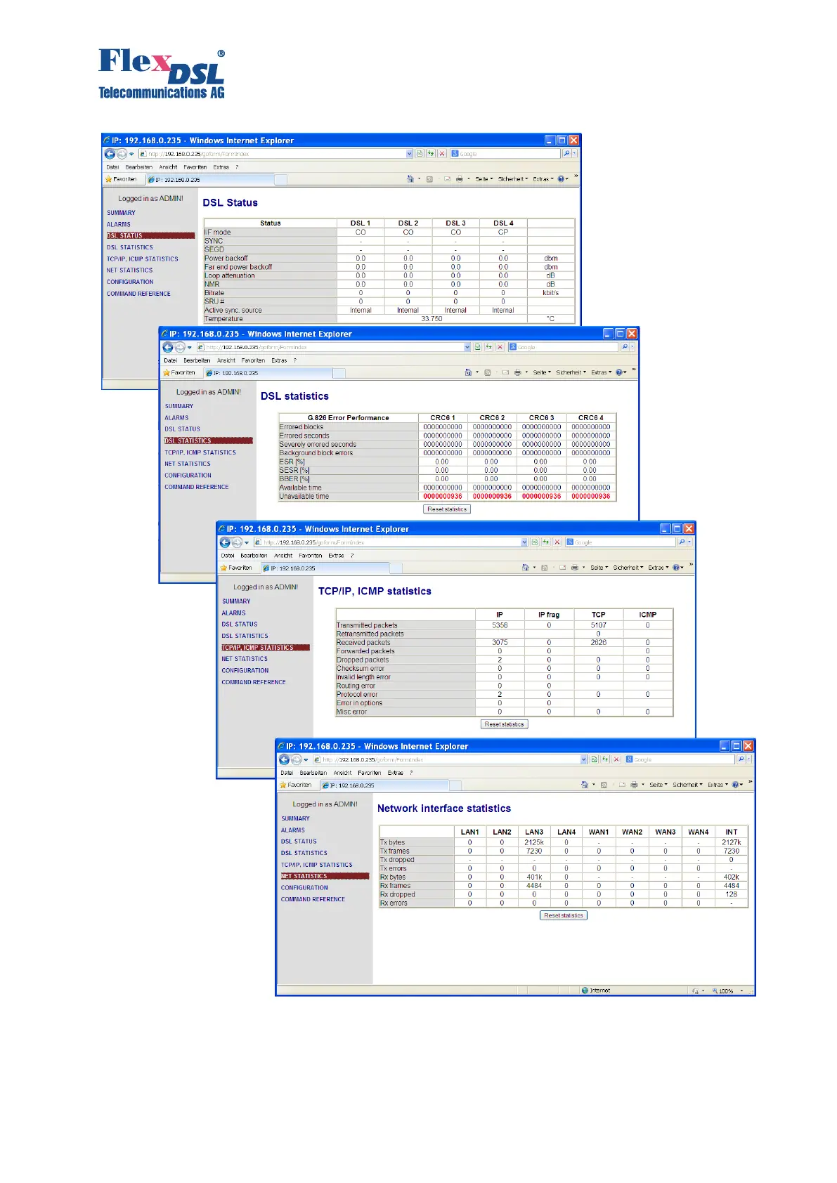 Figure 3.24 WEB interface “Orion 3 DSL Status, Statistics G.826, WAN (Net) Statistics, E1