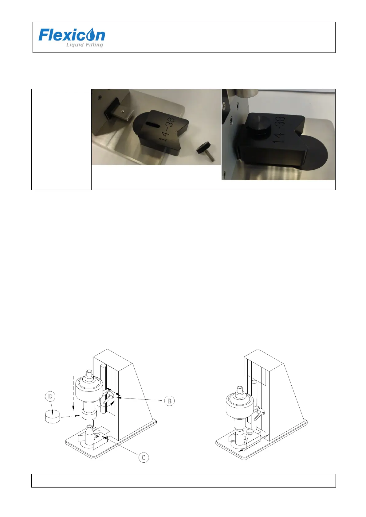 Loosen the handle “B” and lower the capping head until it is just above the bottle neck.