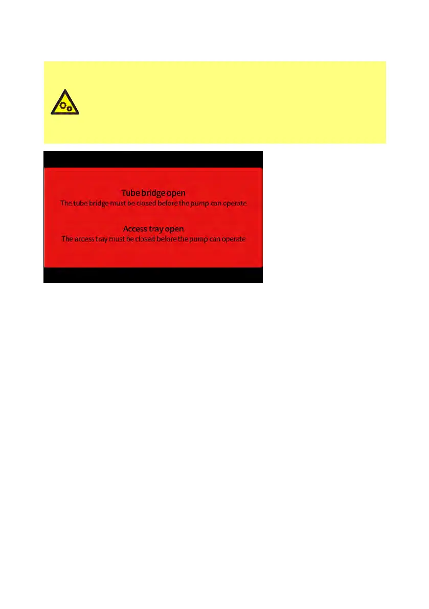 The tube bridge must be closed for the warning screen to clear and the pump to