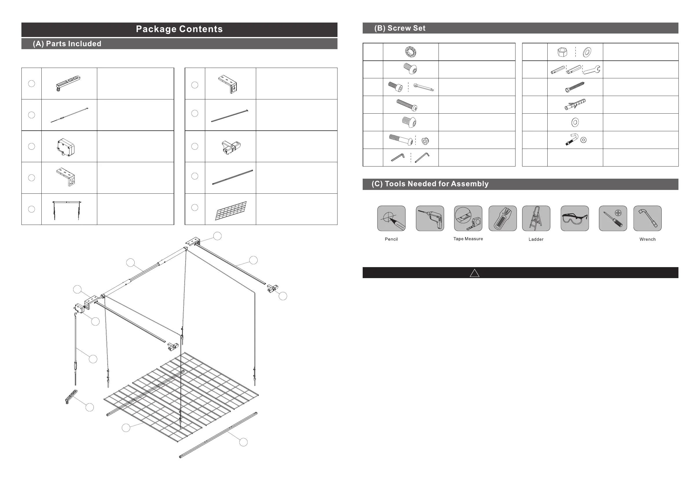 Note:To fast the installation, we recommend to use electrical drill for tightening the screws and bolts.