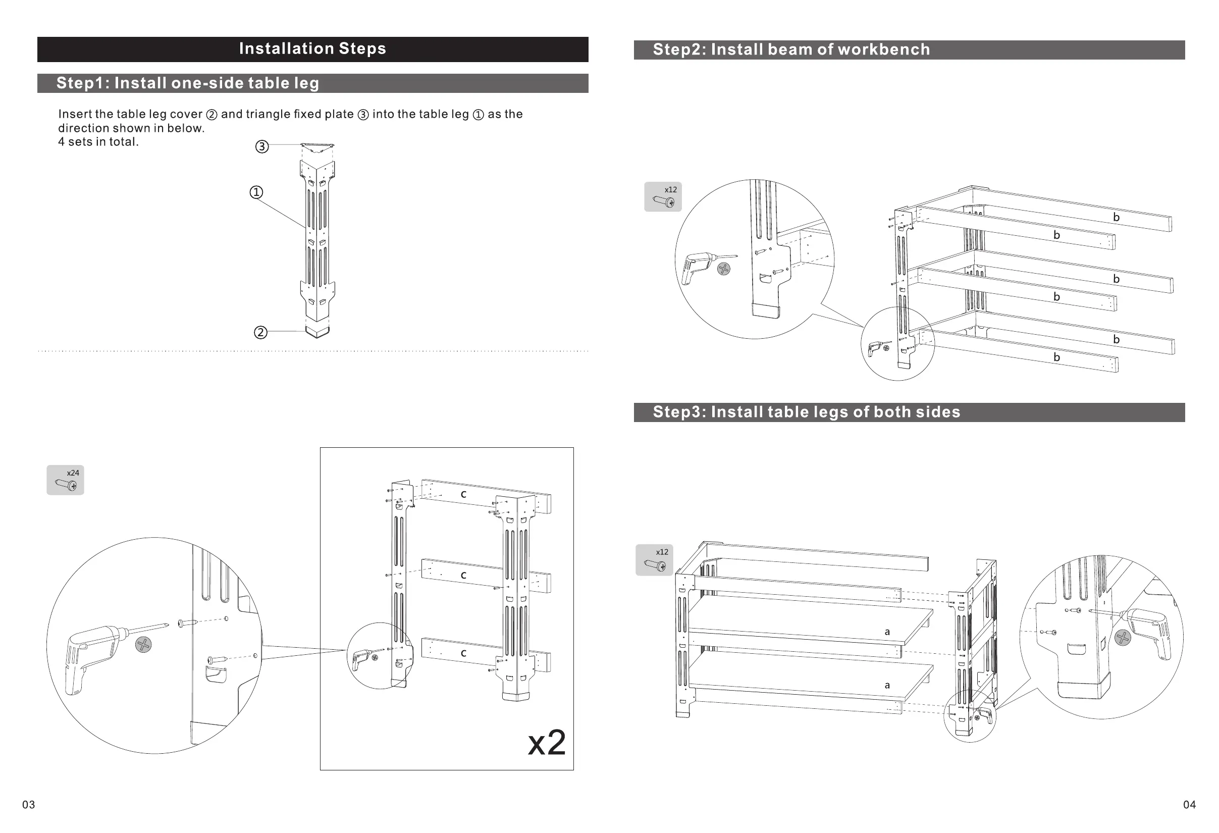 Fleximounts WB107B - Assembly Instructions; Step 1: Install one-side table leg; Step 2: Install beam of workbench; Step 3: Install table legs of both sides