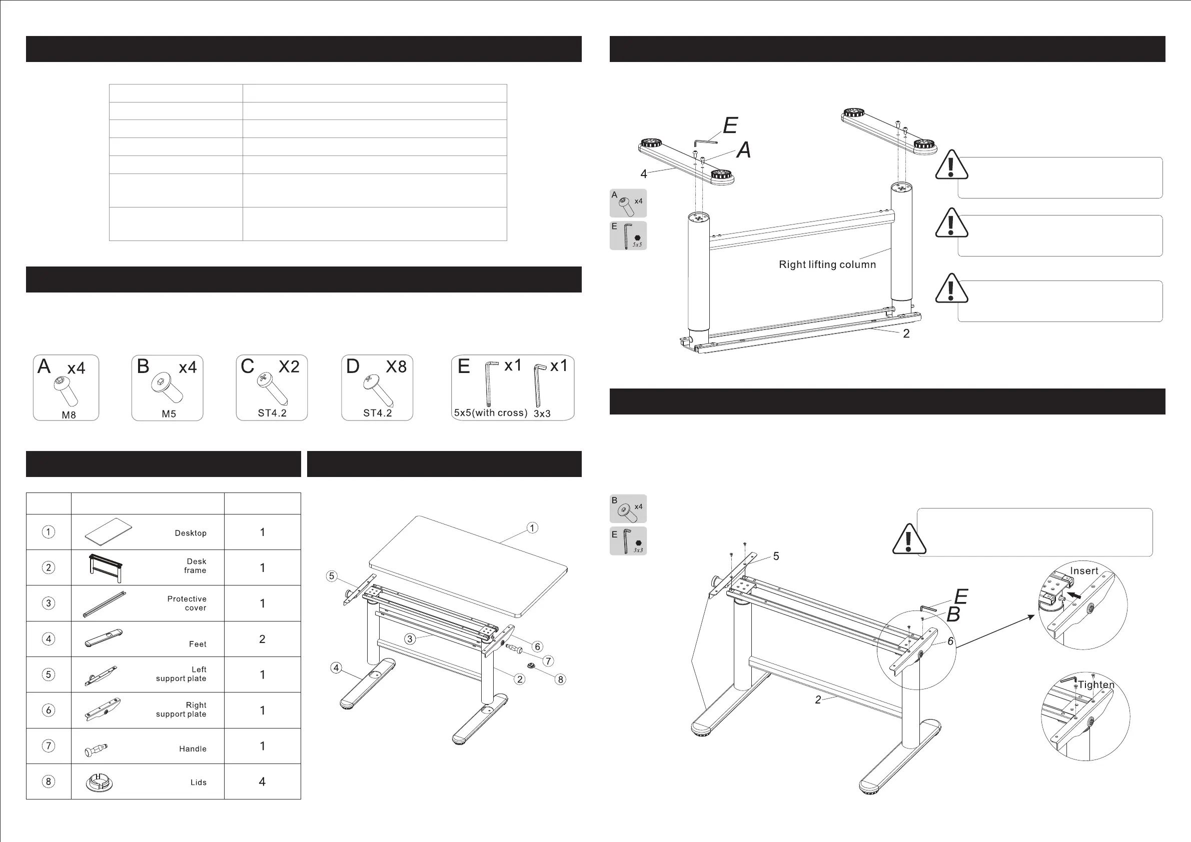 Connect the feet (4) with screws (A) to the desk frame(2), and lock them with a 5 x 5