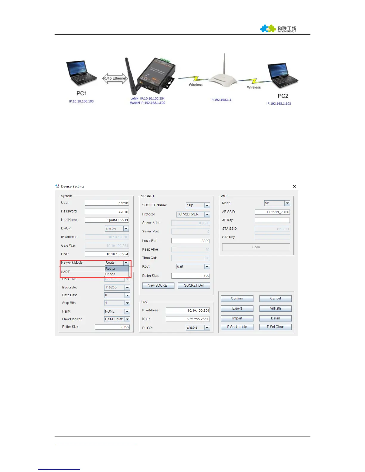 The HF2211 device Ethernet interface work in router mode. When connect to router, it will get IP