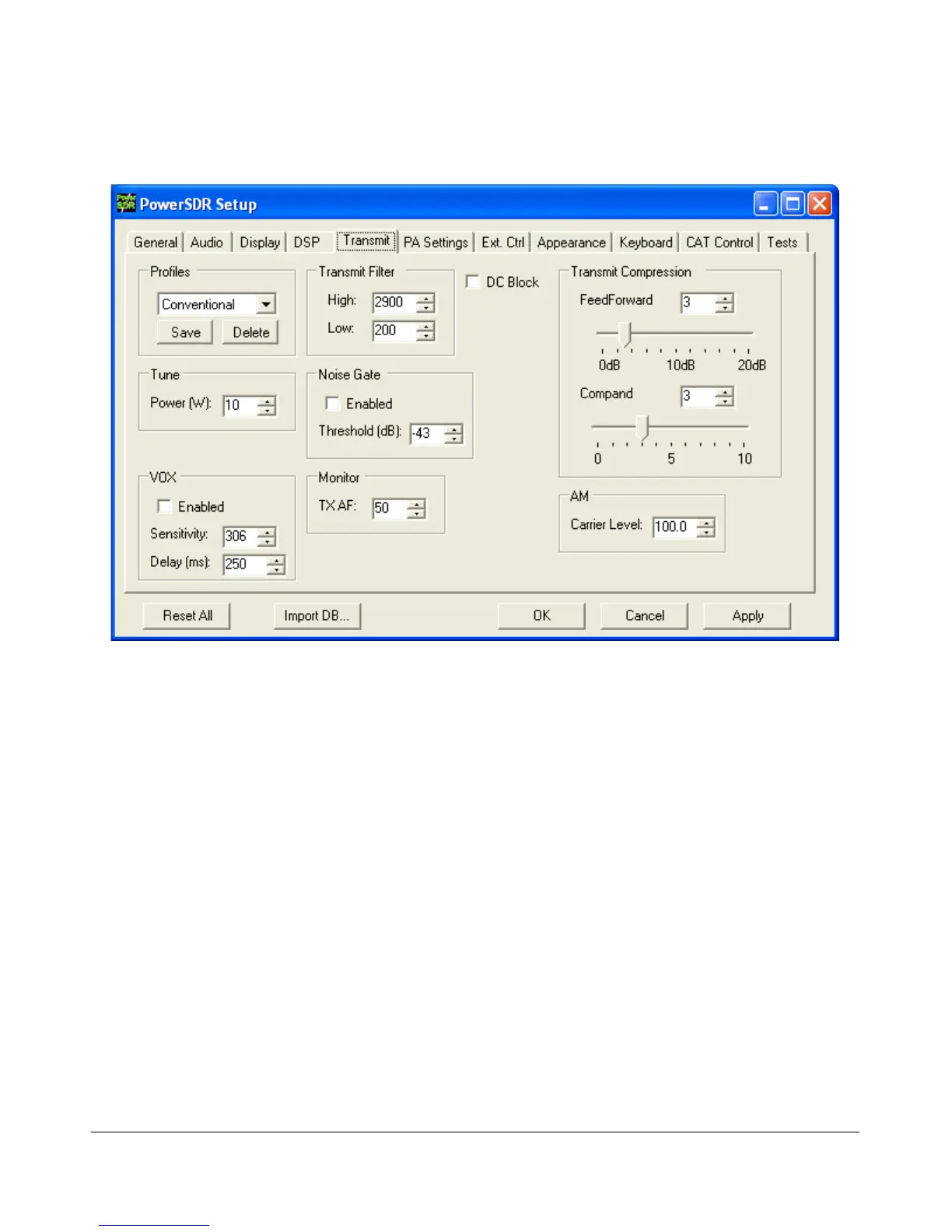 The transmit Tab has controls that allow the user to tailor the transmit signal characteristics using features