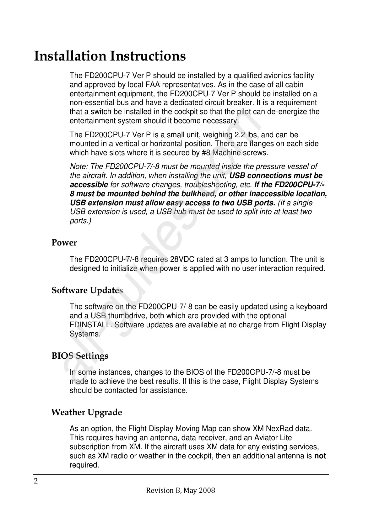 The FD200CPU-7 Ver P should be installed by a qualified avionics facility