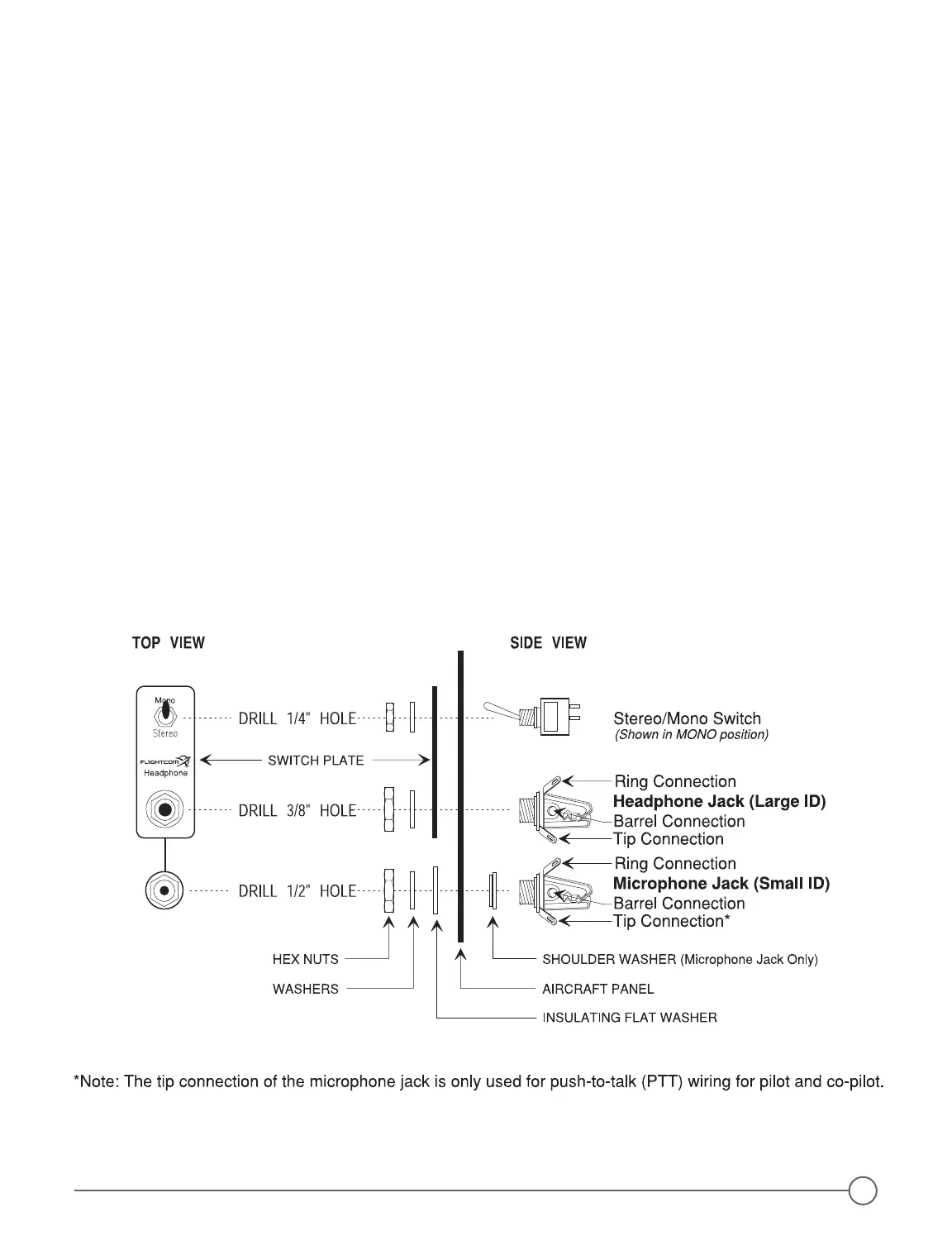3. Drill one 1/4 inch hole in the aircraft panel for each stereo/mono switch and one 3/8 inch hole for each head